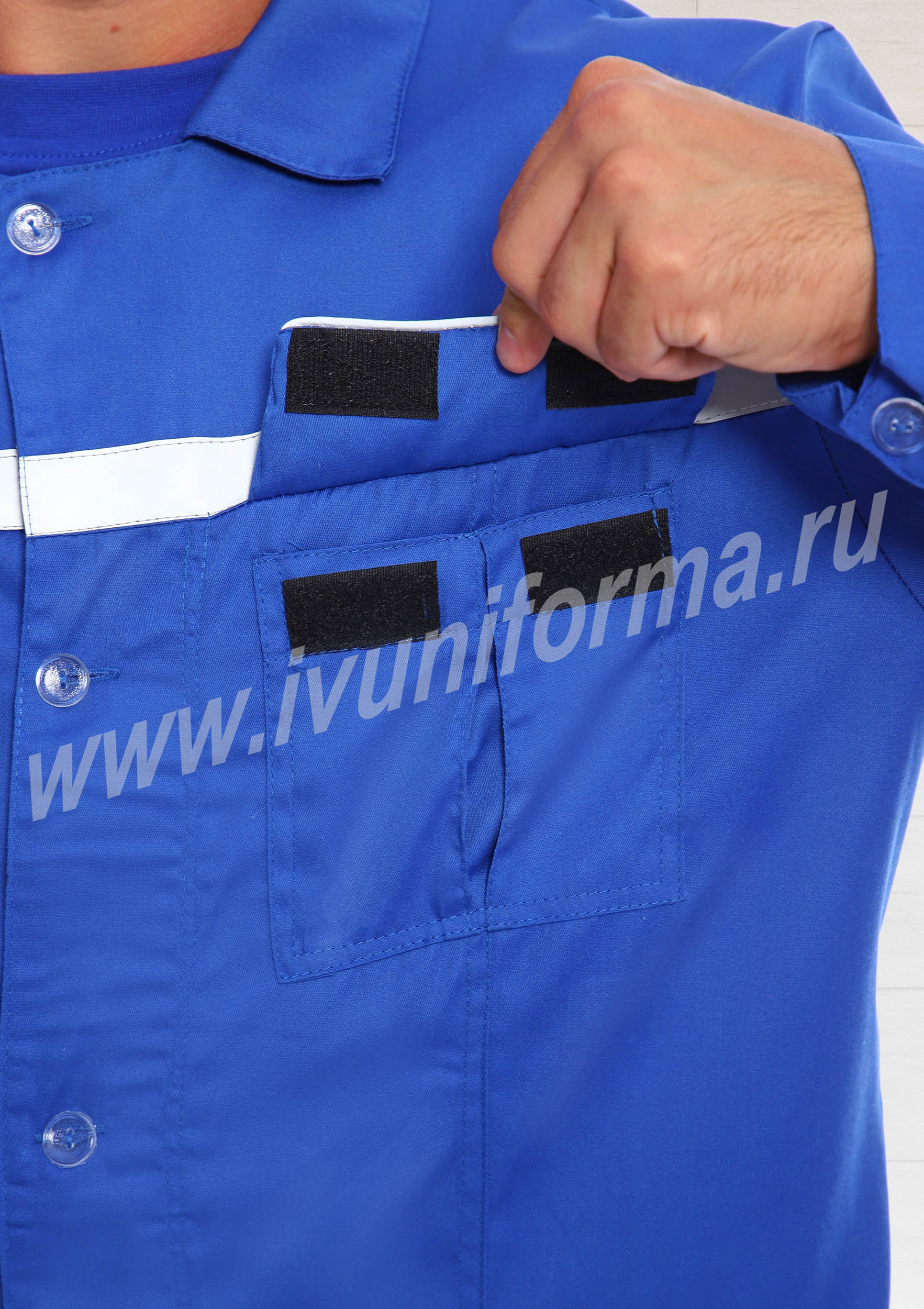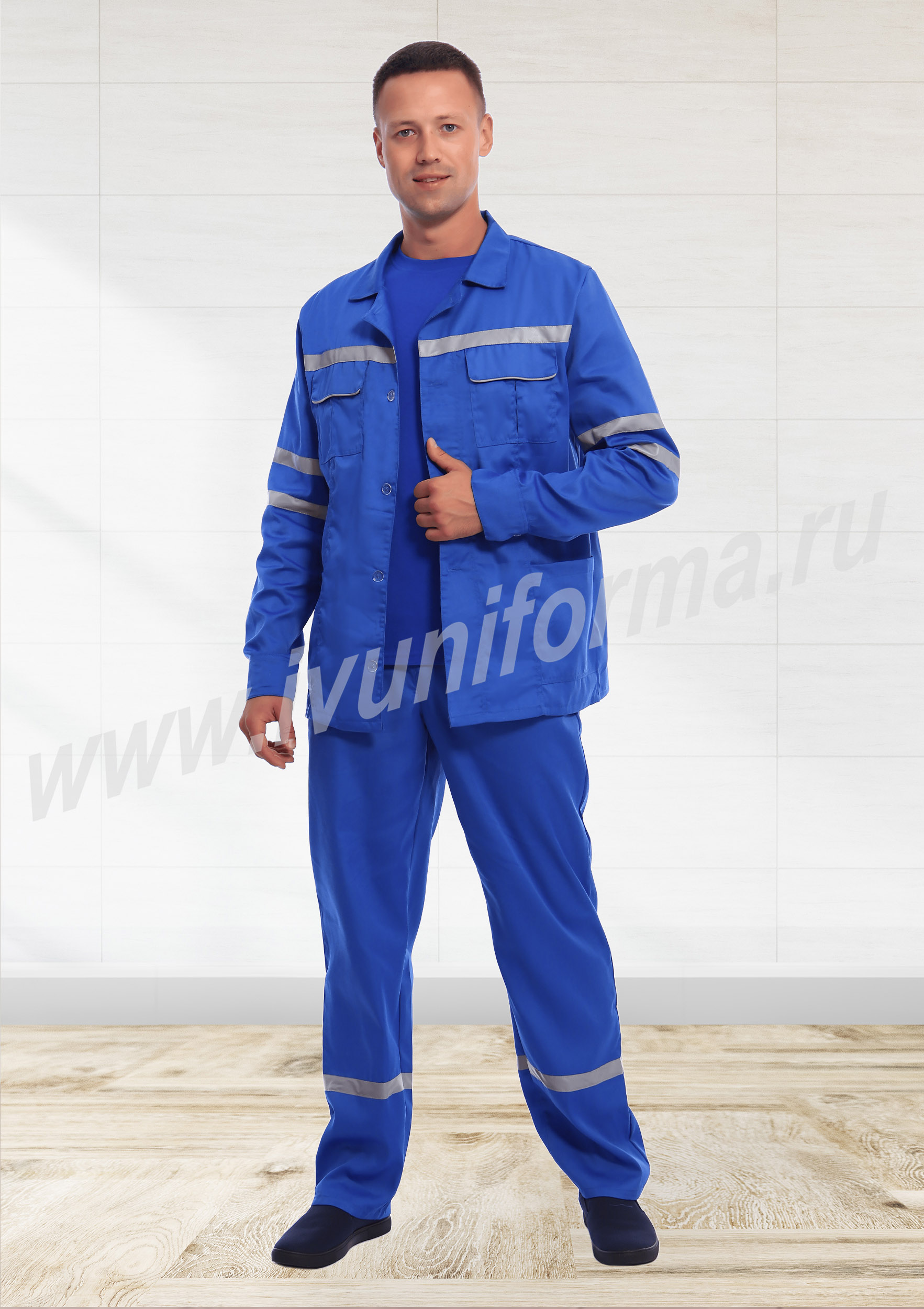 Костюм медицинский мужской состоит из куртки и брюк. Куртка удлиненная, прямого силуэта, с застежкой на пуговицы, с двумя нагрудными карманами с клапанами и застежками на липучку "Velcro", и двумя нижними накладными карманами. Рукав на манжете и застежкой на пуговицы. На передней части, спинке и рукавах расположены светоотражающие ленты. Брюки прямого силуэта с притачным поясом на эластичной ленте .На брюках два передних кармана с косой линией входа. Гульфик на молнии. По низу брюк расположены светоотражающие ленты.